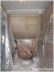 結局、もう一度テープとビニールシートで壁と床をカバーして(前回は二人でやったけど、今回はわたしひとりで)、塗りなおし。下地用を塗り、乾かして、仕上げ。